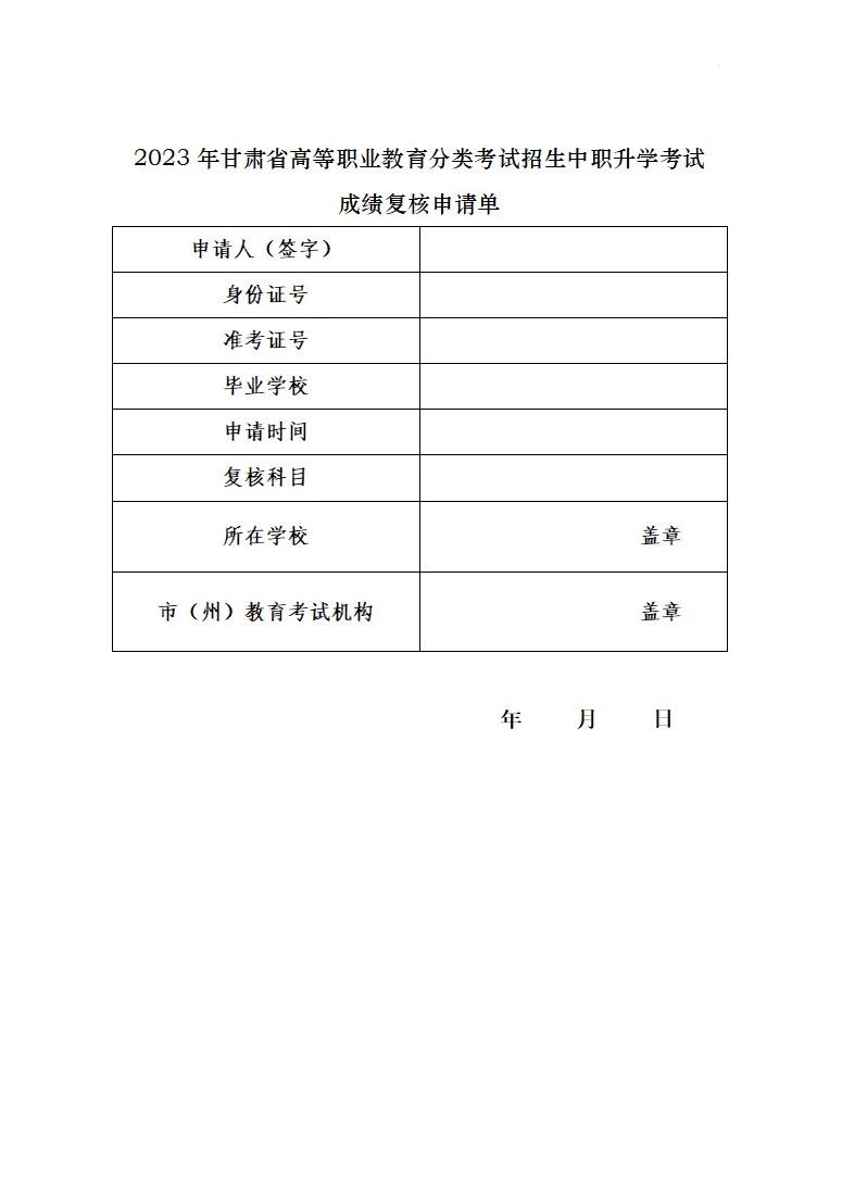 附件:2023年甘肅省高等職業(yè)教育分類考試招生中職升學(xué)考試成績復(fù)核申請單