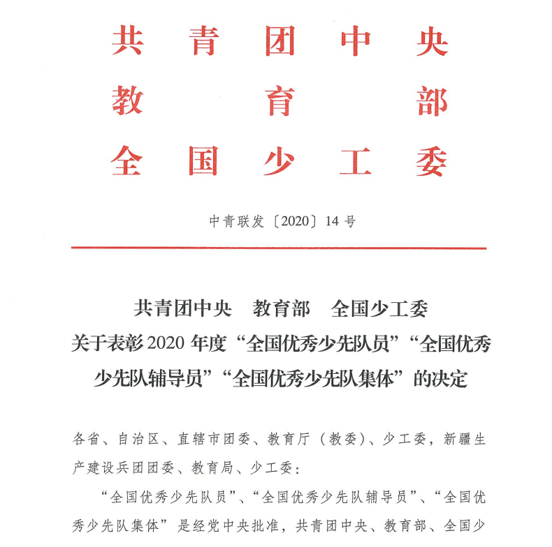 表彰2020年度“全國優(yōu)秀少先隊(duì)員”