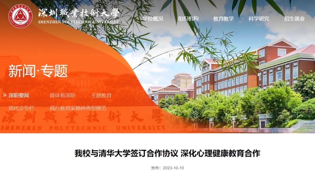 深圳職業(yè)技術(shù)大學(xué)官網(wǎng)發(fā)布消息,近日,深圳職業(yè)技術(shù)大學(xué)與清華大學(xué)合作簽約儀式在深職大舉行。依托雙方共建的深職大積極心理學(xué)研究中心,雙方將在心理健康教育方面開(kāi)展深入合作,進(jìn)一步推動(dòng)積極心理學(xué)在中國(guó)的發(fā)展和應(yīng)用。