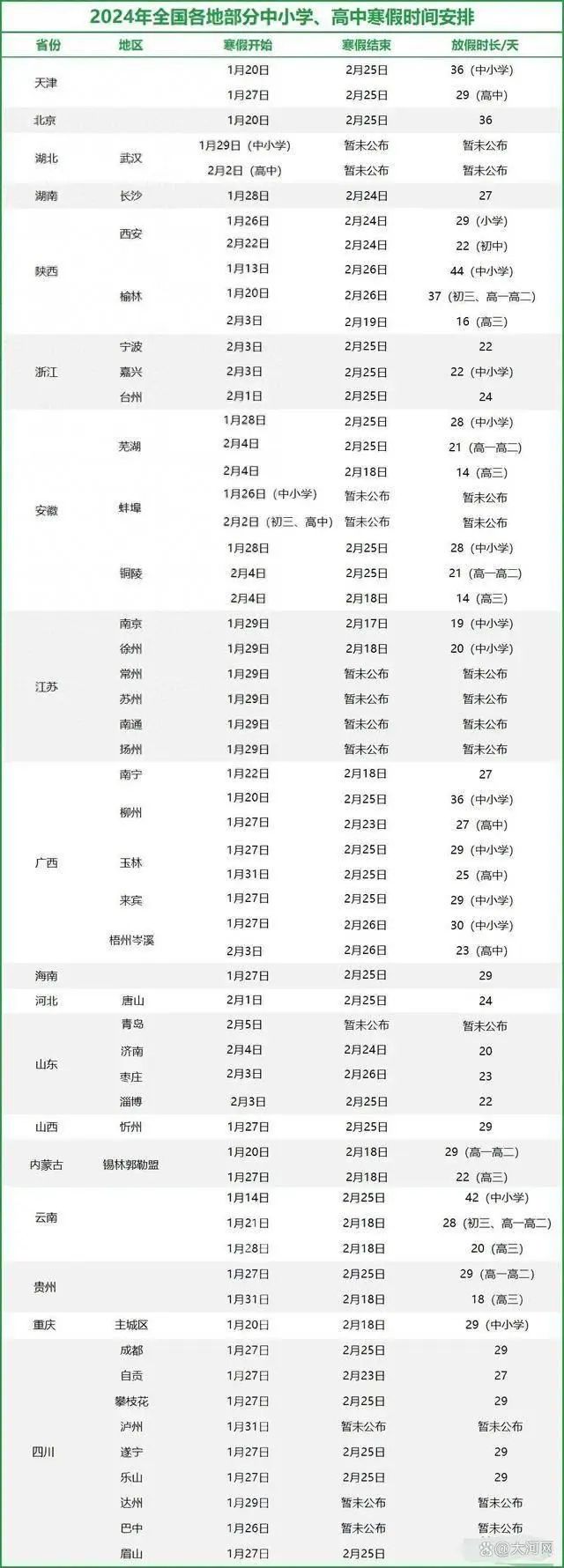 根據(jù)各地校歷來看,中小學(xué)寒假大部分是從1月底開始,寒假時長大部分都在20天以上。