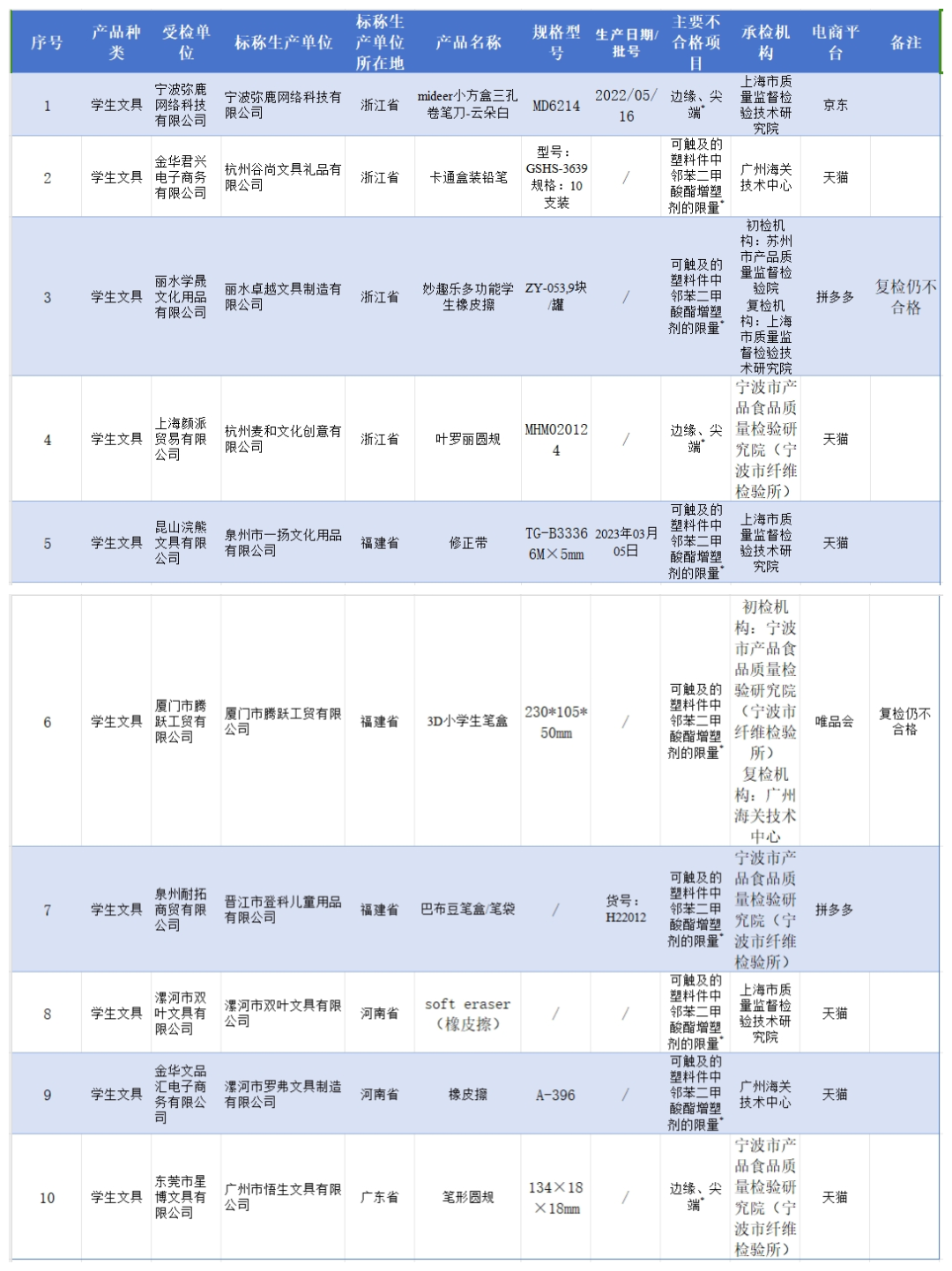 10批次不合格樣品信息