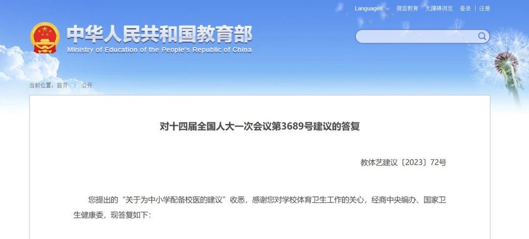 近日,教育部在答復(fù)十四屆全國人大一次會(huì)議第3689號(hào)建議,即“關(guān)于為中小學(xué)配備校醫(yī)的建議”。