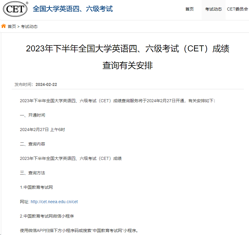 據(jù)教育部教育考試院消息,2023年下半年全國大學英語四、六級考試成績查詢服務將于2月27日6時開通,考生可通過中國教育考試網(wǎng)及其相關小程序進行查詢。