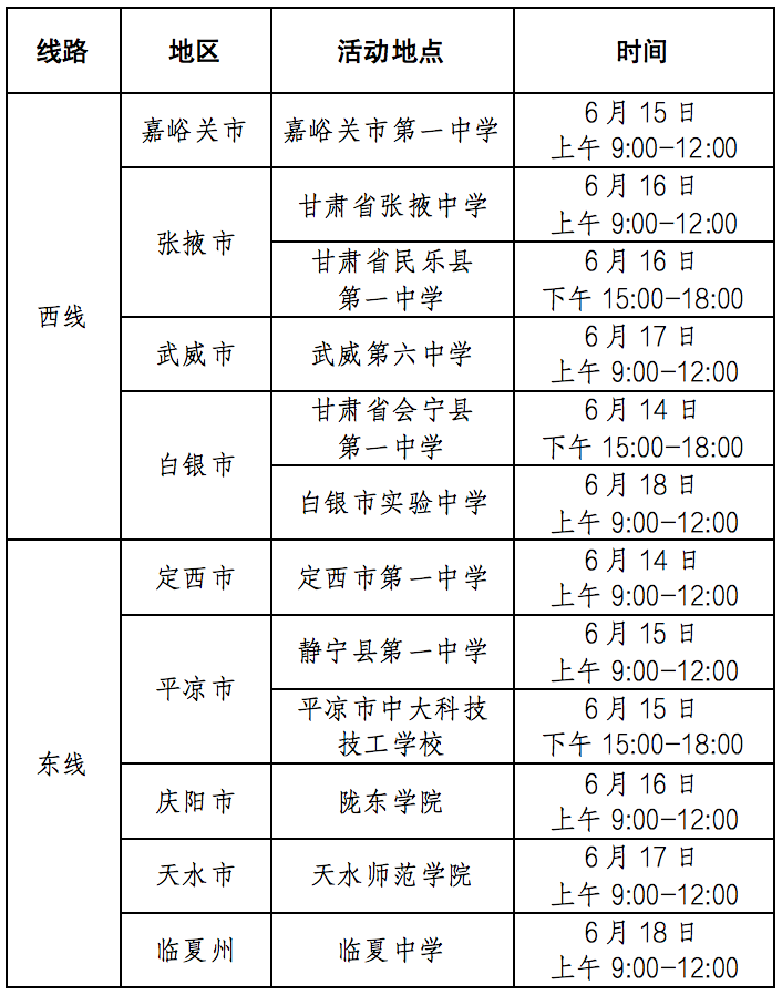 為推進我省高考綜合改革順利落地,做好考生志愿填報咨詢服務,幫助考生掌握高考綜合改革各項招生政策,了解招生院校辦學特色、專業(yè)優(yōu)勢,助力隴原學子圓夢,甘肅省教育考試院和蘭州大學聯(lián)合有關高校舉辦2024年高校招生“隴原行”宣傳活動,赴我省部分市(州)、縣(市、區(qū))現(xiàn)場與考生面對面開展高考志愿政策宣講和報考咨詢服務。具體安排如下: