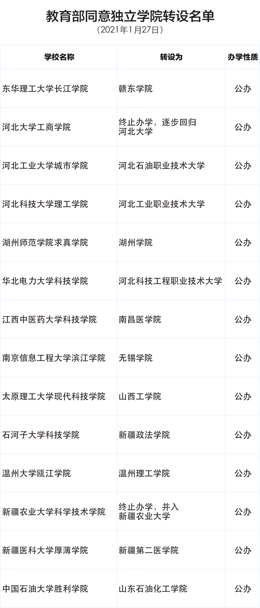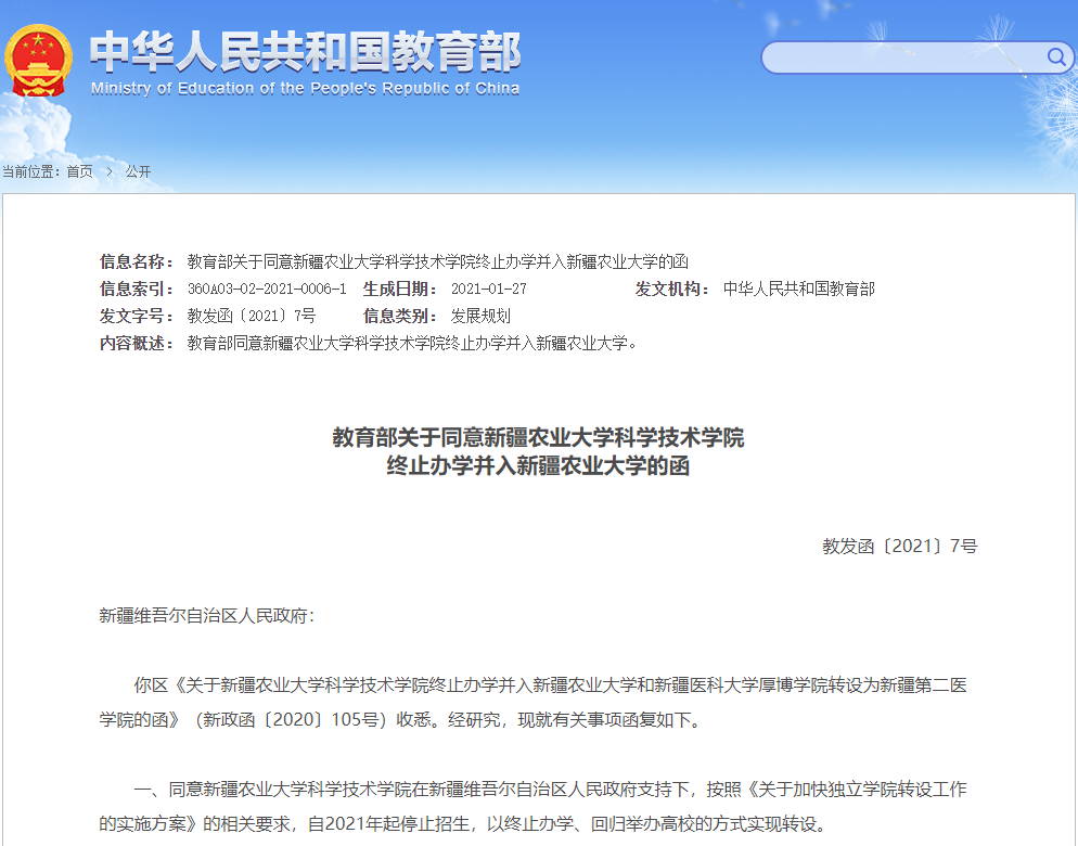 此外,同意新疆農(nóng)業(yè)大學(xué)科學(xué)技術(shù)學(xué)院、河北大學(xué)工商學(xué)院2所獨(dú)立學(xué)院以終止辦學(xué)方式實(shí)現(xiàn)轉(zhuǎn)設(shè)。其中,新疆農(nóng)業(yè)大學(xué)科學(xué)技術(shù)學(xué)院將并入新疆農(nóng)業(yè)大學(xué),河北大學(xué)工商學(xué)院回歸舉辦高校(河北大學(xué))。