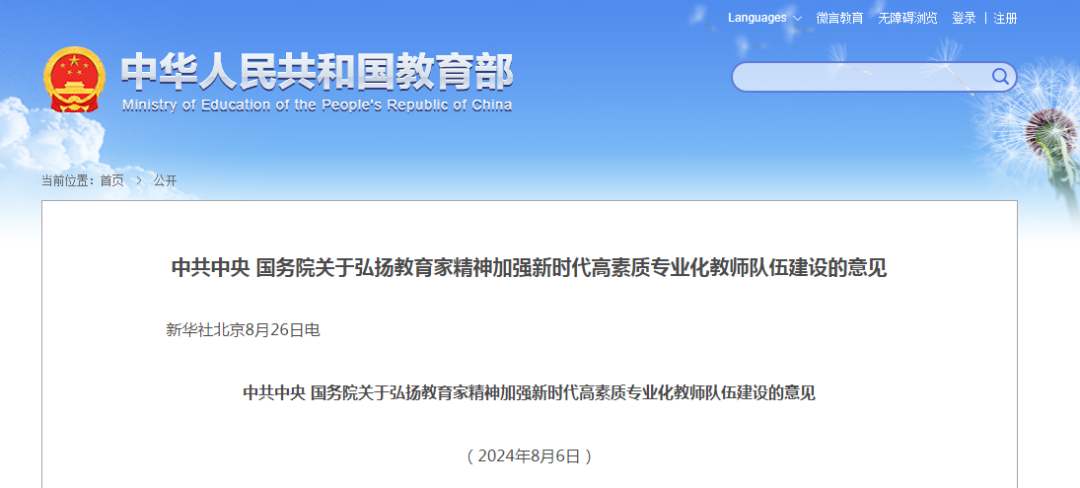 8月26日發(fā)布的《中共中央國(guó)務(wù)院關(guān)于弘揚(yáng)教育家精神加強(qiáng)新時(shí)代高素質(zhì)專業(yè)化教師隊(duì)伍建設(shè)的意見》明確提出,