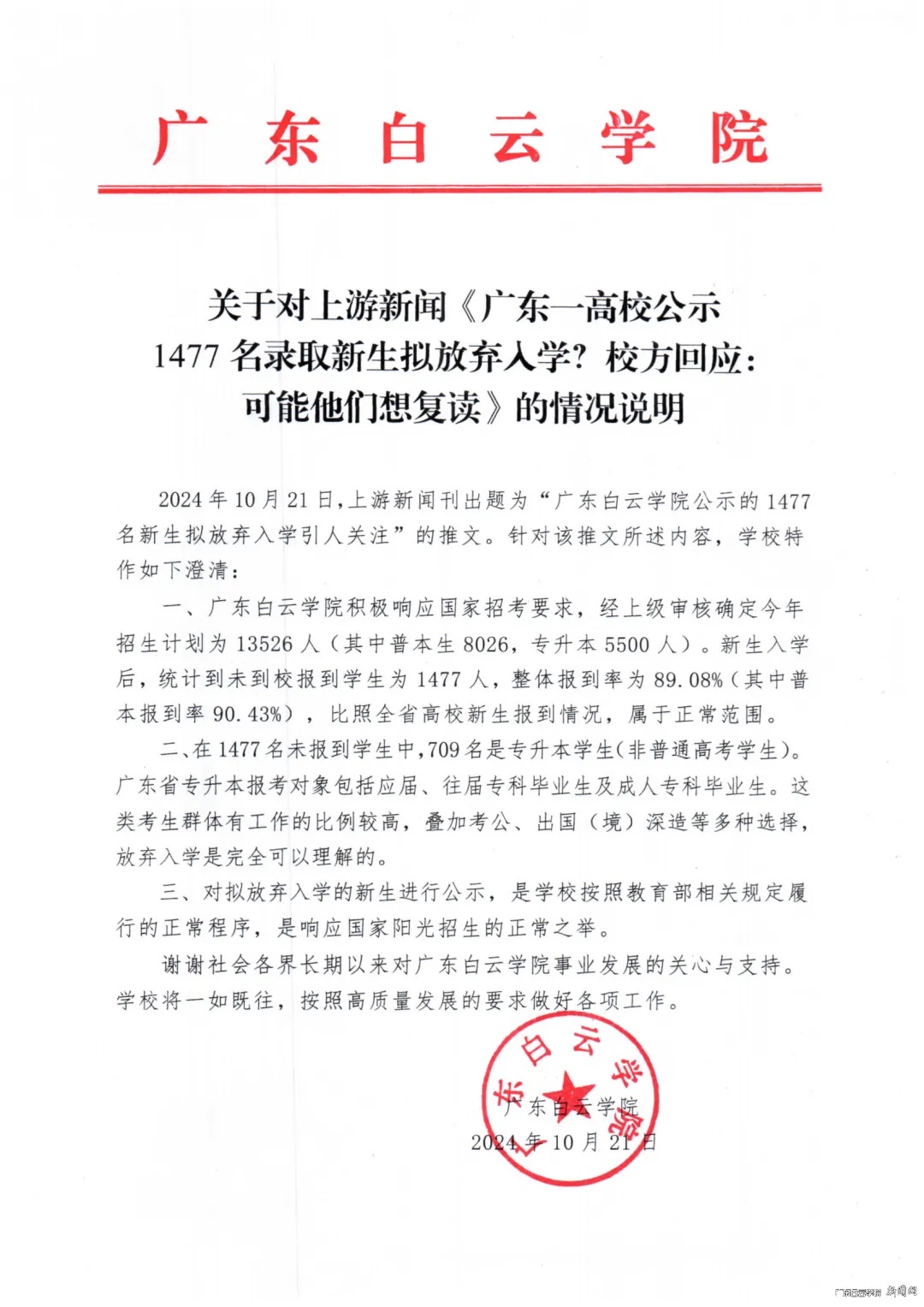 據(jù)人民日報客戶端消息,近日,廣東白云學(xué)院公示1477名新生擬放棄入學(xué)的消息登上微博熱搜,引發(fā)關(guān)注。10月21日,廣東白云學(xué)院對此發(fā)布情況說明:2024年10月21日,上游新聞刊出題為“廣東白云學(xué)院公示的1477名新生擬放棄入學(xué)引人關(guān)注”的推文。針對該推文所述內(nèi)容,學(xué)校特作如下澄清:一、廣東白云學(xué)院積極響應(yīng)國家招考要求,經(jīng)上級審核確定今年招生計劃為13526人(其中普本生8026,專升本5500人)。新生入學(xué)后,統(tǒng)計到未到校報到學(xué)生為1477人,整體報到率為89.08%(其中普本報到率90.43%),比照全省高校新生報到情況,屬于正常范圍。二、在1477名未報到學(xué)生中,709名是專升本學(xué)生(非普通高考學(xué)生)。廣東省專升本報考對象包括應(yīng)屆、往屆??飘厴I(yè)生及成人專科畢業(yè)生。這類考生群體有工作的比例較高,疊加考公、出國(境)深造等多種選擇,放棄入學(xué)是完全可以理解的。三、對擬放棄入學(xué)的新生進(jìn)行公示,是學(xué)校按照教育部相關(guān)規(guī)定履行的正常程序,是響應(yīng)國家陽光招生的正常之舉。謝謝社會各界長期以來對廣東白云學(xué)院事業(yè)發(fā)展的關(guān)心與支持。學(xué)校將一如既往,按照高質(zhì)量發(fā)展的要求做好各項工作。據(jù)該校官網(wǎng)介紹,廣東白云學(xué)院創(chuàng)建于1989年,是教育部批準(zhǔn)成立的全日制普通本科院校。2009年通過學(xué)士學(xué)位授予單位授權(quán)點評審,2011年通過教育部本科教學(xué)工作合格評估,2018年接受教育部本科教學(xué)工作審核評估。2022年獲批廣東省博士工作站。學(xué)校位于廣東省廣州市,現(xiàn)有兩個校區(qū),西校區(qū)位于白云區(qū)江高鎮(zhèn),北校區(qū)位于白云區(qū)鐘落潭高校園區(qū),面向全國17個?。ㄗ灾螀^(qū))招生,目前擁有全日制在校生33600多人。