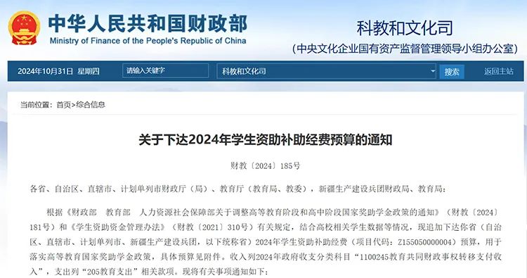 日前,財(cái)政部、教育部聯(lián)合發(fā)布《關(guān)于下達(dá)2024年學(xué)生資助補(bǔ)助經(jīng)費(fèi)預(yù)算的通知》,
