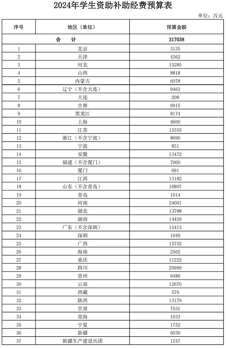 下達(dá)2024年學(xué)生資助補(bǔ)助經(jīng)費(fèi)預(yù)算,預(yù)算總金額317038萬元。