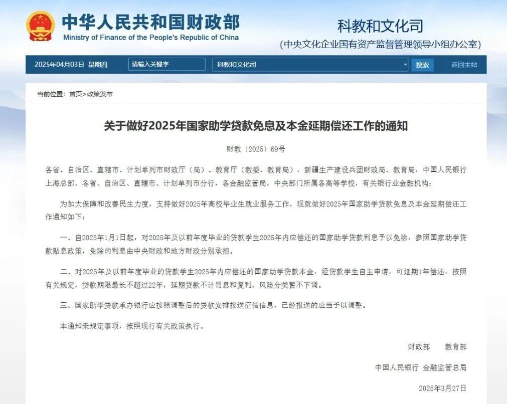 自2025年1月1日起,對2025年及以前年度畢業(yè)的貸款學(xué)生2025年內(nèi)應(yīng)償還的國家助學(xué)貸款利息予以免除,