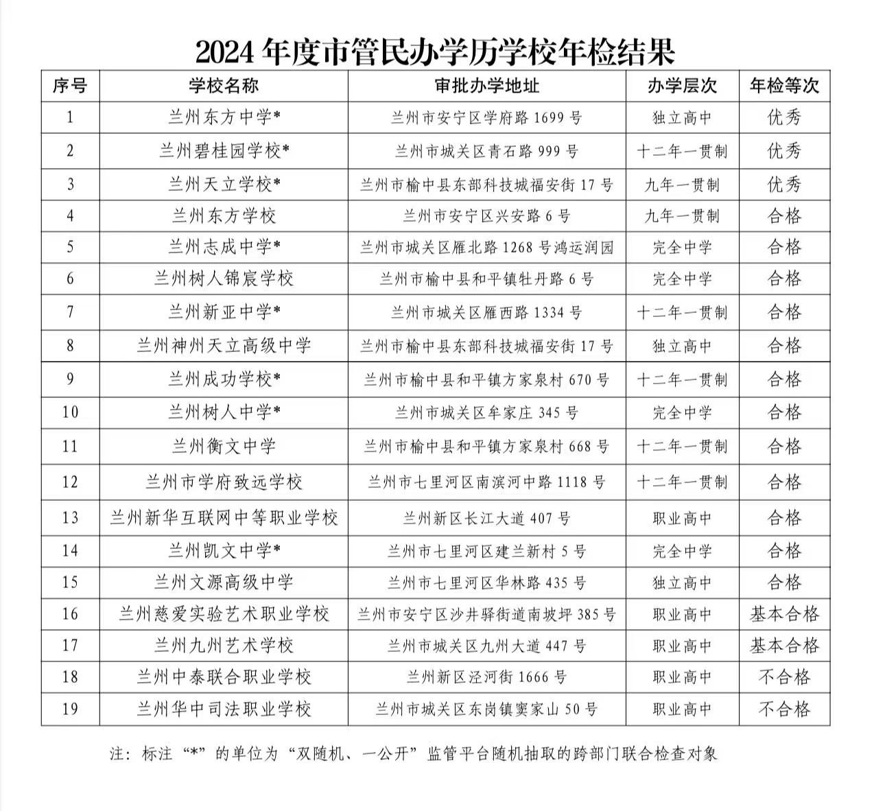依據(jù)《中華人民共和國(guó)民辦教育促進(jìn)法》《中華人民共和國(guó)民辦教育促進(jìn)法實(shí)施條例》《甘肅省教育廳關(guān)于做好民辦學(xué)校2024年度年檢工作的通知》《甘肅省教育廳關(guān)于印發(fā)2025年度“雙隨機(jī)、一公開(kāi)”監(jiān)管工作實(shí)施方案的通知》《關(guān)于開(kāi)展市管民辦學(xué)歷學(xué)校2024年度年檢工作的通知》要求,蘭州市教育局組織完成了2024年度市管民辦學(xué)歷學(xué)校年檢工作,現(xiàn)將各學(xué)校年檢結(jié)果公告如下: