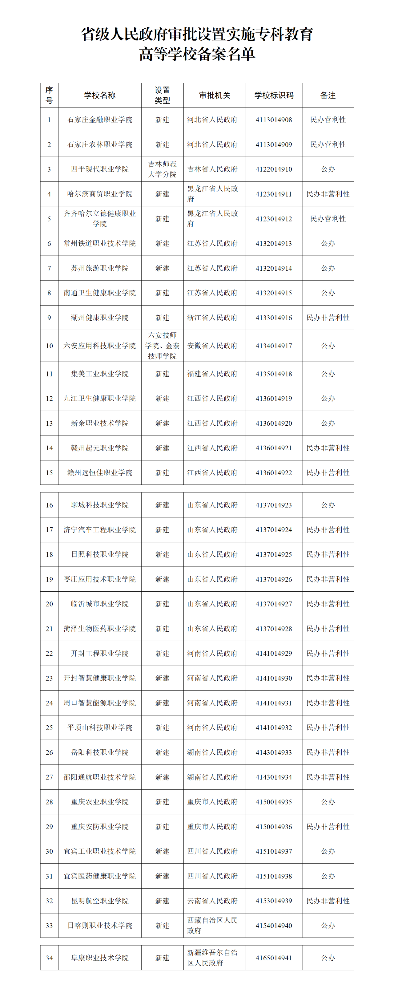 根據(jù)《中華人民共和國(guó)高等教育法》《普通高等學(xué)校設(shè)置暫行條例》等有關(guān)法律法規(guī)和政策文件的規(guī)定,現(xiàn)將省級(jí)人民政府審批設(shè)置的??茖哟胃叩葘W(xué)校備案名單予以公布。