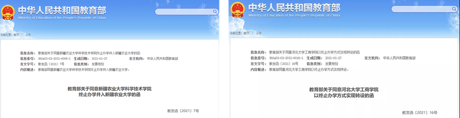 河北大學(xué)工商學(xué)院為“終止辦學(xué)”,新疆農(nóng)業(yè)大學(xué)科學(xué)技術(shù)學(xué)院則為“并入新疆農(nóng)業(yè)大學(xué)”。