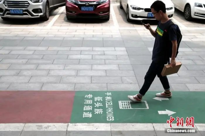 資料圖:西安街頭出現(xiàn)一條專(zhuān)為“低頭族”設(shè)計(jì)的通道。中新社記者 張遠(yuǎn) 攝