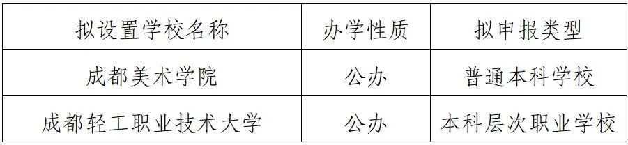 根據(jù)公示信息,擬設(shè)置的成都美術(shù)學(xué)院為公辦普通本科,擬設(shè)置的成都輕工職業(yè)技術(shù)大學(xué)為公辦職業(yè)本科。