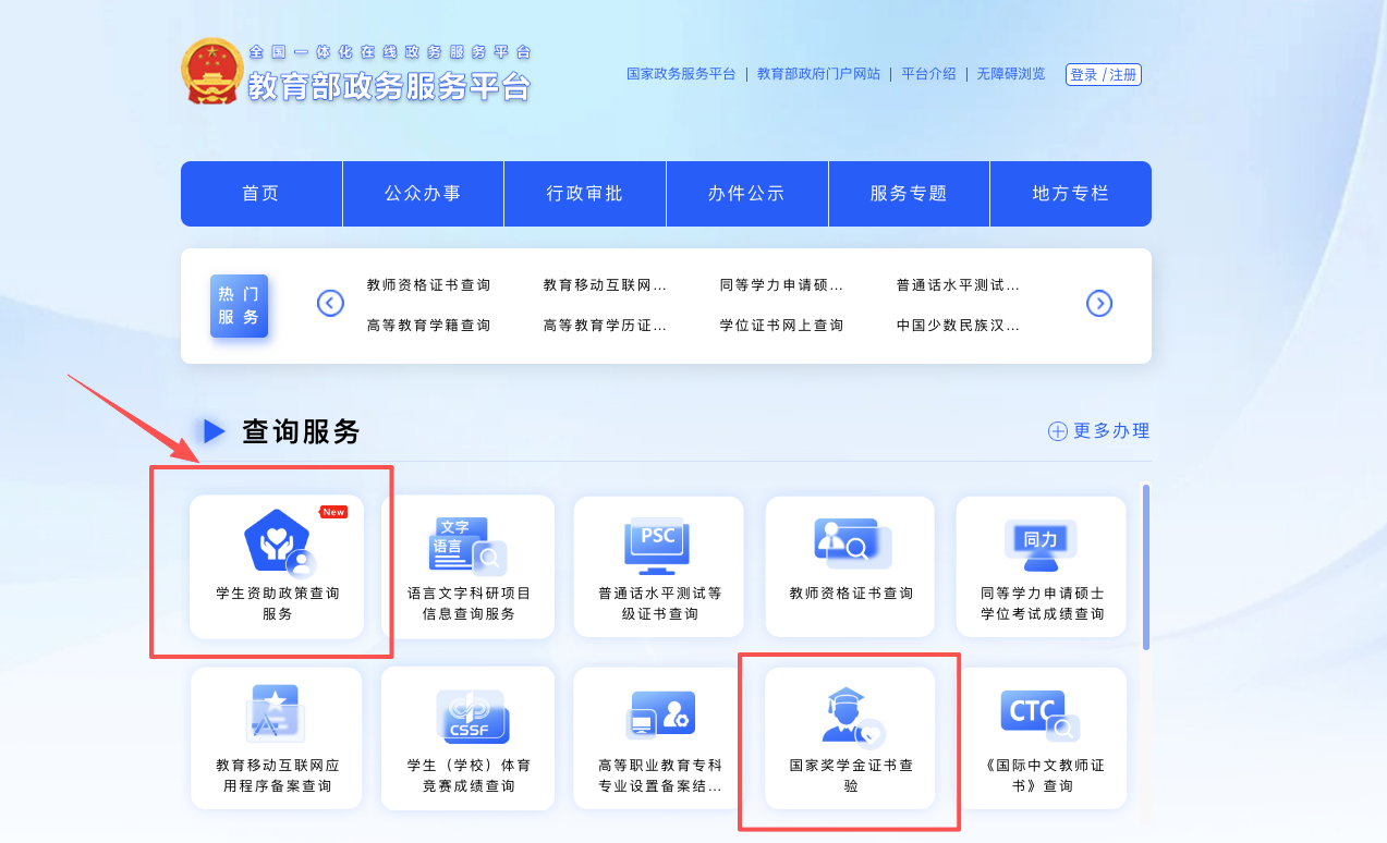 1.訪問教育部政務(wù)服務(wù)平臺(https://zwfw.moe.gov.cn/,即教育部官方網(wǎng)站服務(wù)板塊),在“查詢服務(wù)”板塊,選擇使用“學(xué)生資助政策查詢服務(wù)”;