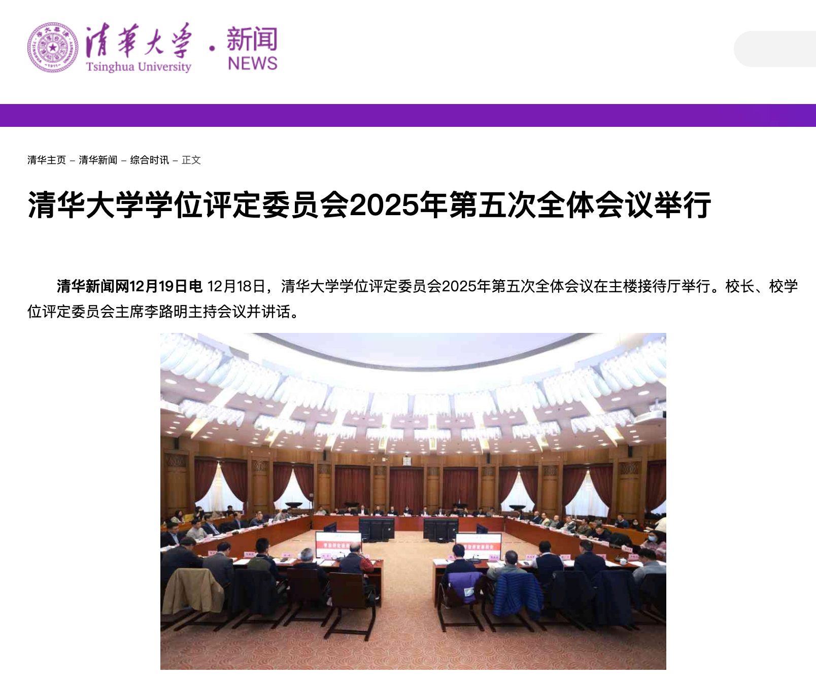 據(jù)清華大學(xué)新聞網(wǎng)消息:12月18日,清華大學(xué)學(xué)位評(píng)定委員會(huì)2025年第五次全體會(huì)議在主樓接待廳舉行。清華大學(xué)校長、校學(xué)位評(píng)定委員會(huì)主席李路明主持會(huì)議并講話。