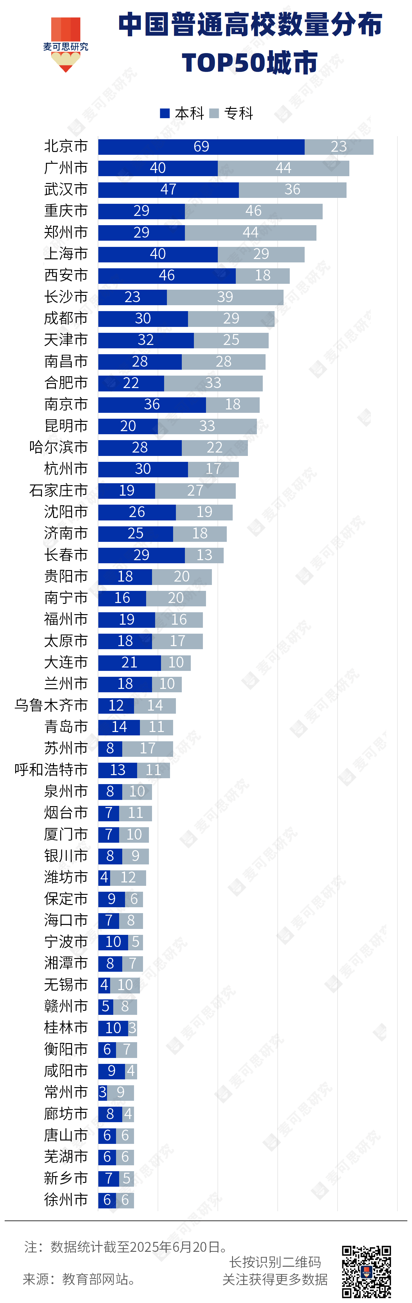 根據(jù)教育部數(shù)據(jù),截至2025年6月20日,全國普通高等學校2919所,分布在345個城市、自治州。其中,北京(92所)、廣州(84所)、武漢(83所)、重慶(75所)、鄭州(73所)、上海(69所)、西安(64所)、長沙(62所)、成都(59所)、天津(57所)是擁有高校數(shù)量最多的10個城市。