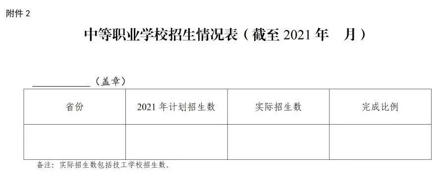 教育部將繼續(xù)實(shí)施招生通報(bào)制度。請各地于2021年4月15日前將高中階段教育學(xué)校招生計(jì)劃表(附件1)報(bào)送教育部(職成司);于8月至11月的每月月底前將中職招生進(jìn)展情況(附件2)報(bào)送教育部(職成司)。