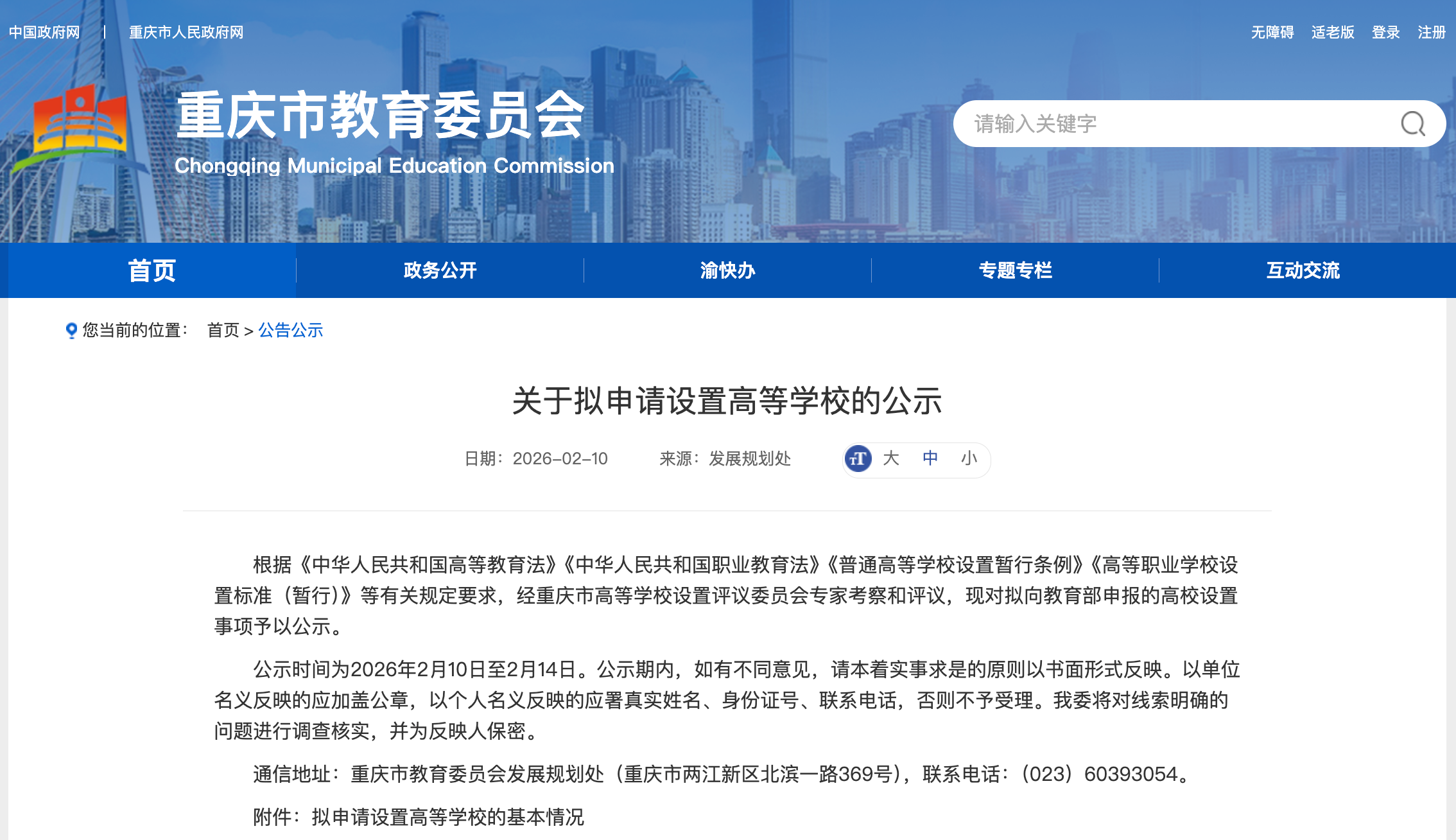 根據(jù)《中華人民共和國高等教育法》《中華人民共和國職業(yè)教育法》《普通高等學(xué)校設(shè)置暫行條例》《高等職業(yè)學(xué)校設(shè)置標(biāo)準(zhǔn)(暫行)》等有關(guān)規(guī)定要求,經(jīng)重慶市高等學(xué)校設(shè)置評議委員會專家考察和評議,現(xiàn)對擬向教育部申報(bào)的高校設(shè)置事項(xiàng)予以公示。公示時(shí)間為2026年2月10日至2月14日。