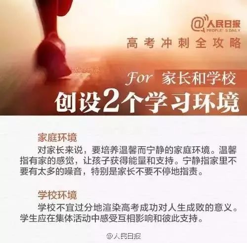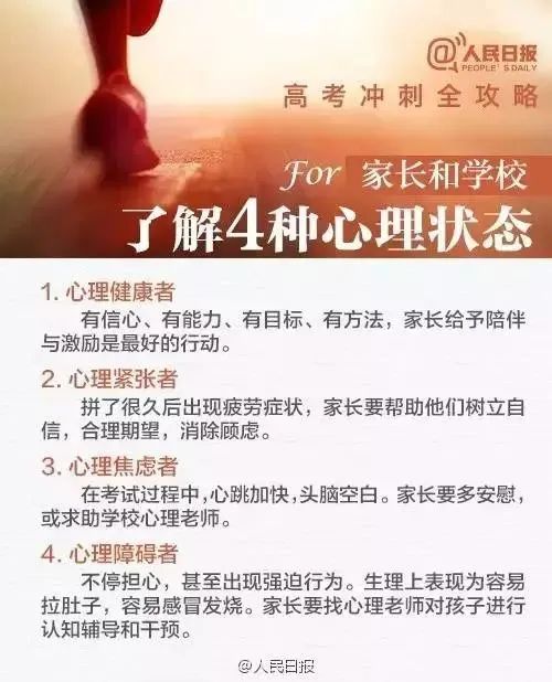 家長要調(diào)整好自己的心態(tài):平常心、平靜心、理解心、愛撫心、激勵心、信任心;高考快樂,快樂高考;尊重孩子的人格、尊重孩子的復(fù)習(xí)方式、尊重孩子的應(yīng)對策略,只要學(xué)生是對的就可以。