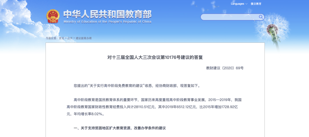 近日,針對(duì)人大代表提出的“關(guān)于全面落實(shí)高中階段免費(fèi)教育,不讓一個(gè)學(xué)生因家庭貧困而失學(xué)的建議”,教育部經(jīng)協(xié)商財(cái)政部,在其官網(wǎng)進(jìn)行答復(fù)。具體來(lái)看一看↓↓↓