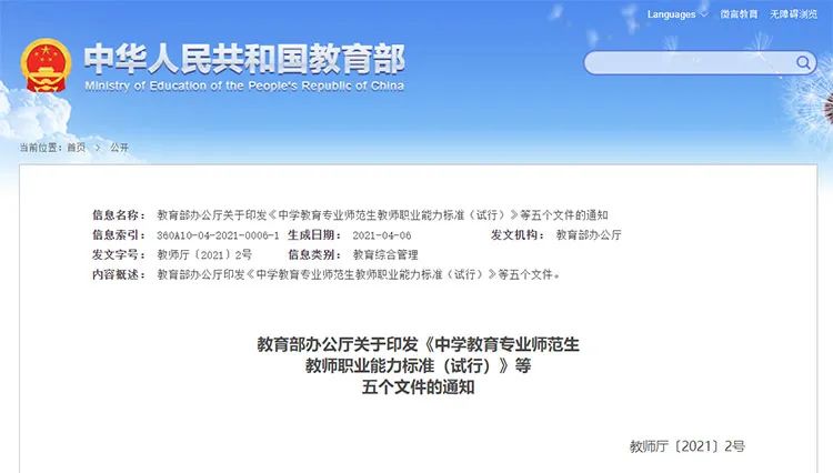 據(jù)教育部教師工作司負責人介紹,《能力標準》共五個文件,分別明確中學教育、小學教育、學前教育、中等職業(yè)教育和特殊教育專業(yè)師范生教師職業(yè)基本能力。每個文件分四個部分提出四大能力,即師德踐行能力、教學實踐能力、綜合育人能力和自主發(fā)展能力。