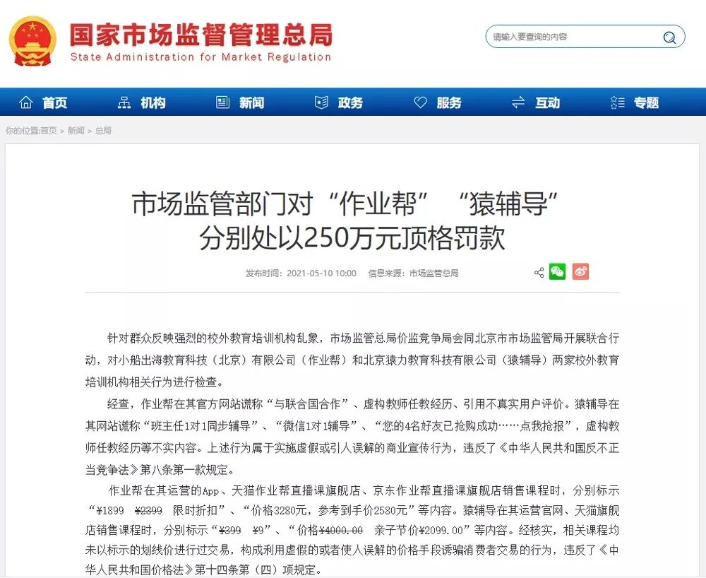2021年5月10日,北京市市場監(jiān)管局依法對(duì)作業(yè)幫和猿輔導(dǎo)兩家校外教育培訓(xùn)機(jī)構(gòu),均處以警告和250萬元頂格罰款的行政處罰。