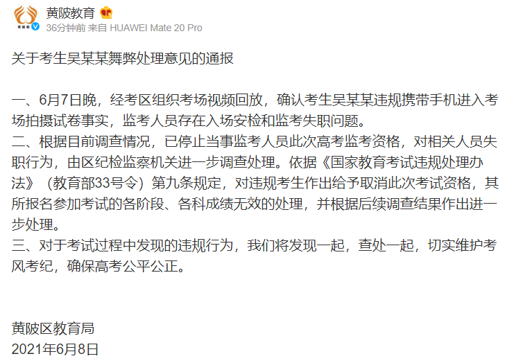 針對網(wǎng)傳湖北考生吳某某將高考數(shù)學(xué)題拍照上傳至搜題APP一事,武漢市黃陂區(qū)教育局官方微博發(fā)布通報: