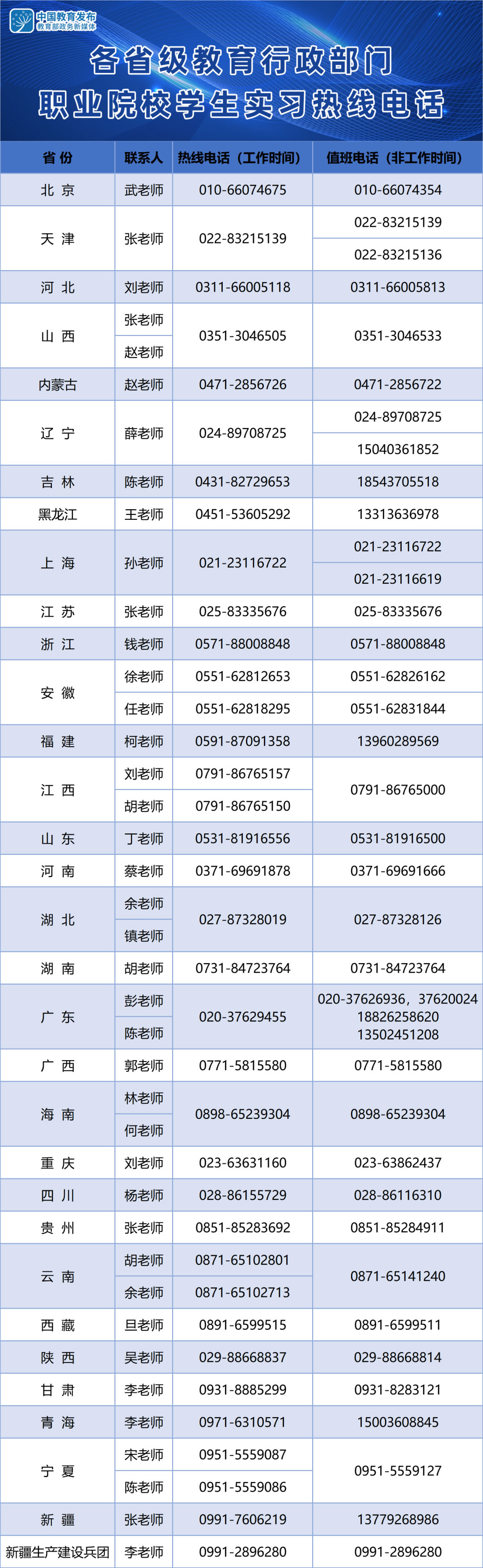 日前,教育部公布職業(yè)院校學生實習管理工作熱線電話。熱線電話專門受理職業(yè)院校學生實習管理方面政策咨詢、建議和有關(guān)問題反映。跟小編一起來看——