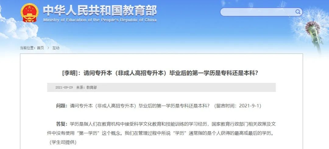 日前,教育部針對網(wǎng)友提問“請問專升本(非成人高招專升本)畢業(yè)后的第一學(xué)歷是??七€是本科?”進行答復(fù)稱:
