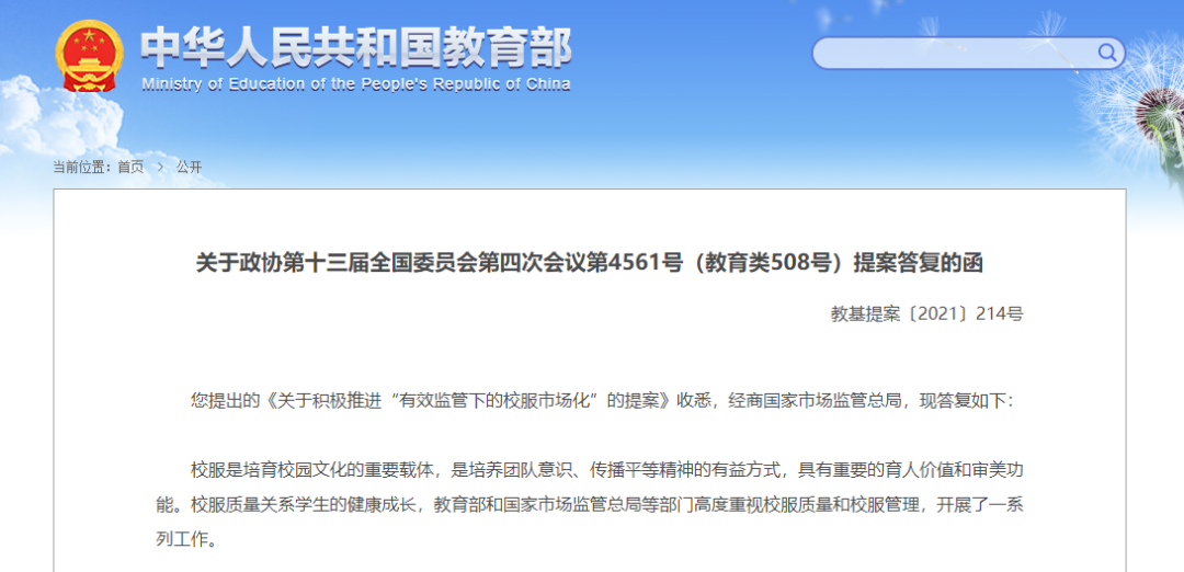 近日,教育部官網(wǎng)公布了《關于政協(xié)第十三屆全國委員會第四次會議第4561號(教育類508號)提案答復的函》,對《關于積極推進“有效監(jiān)管下的校服市場化”的提案》進行了答復。