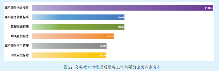 綜合媒體報道評論、業(yè)界聲音及網(wǎng)友意見,圍繞課后服務(wù),輿論關(guān)注點(diǎn)主要集中在課后服務(wù)內(nèi)容安排、課后服務(wù)收費(fèi)標(biāo)準(zhǔn)、教師激勵措施等6個方面。(見圖2)