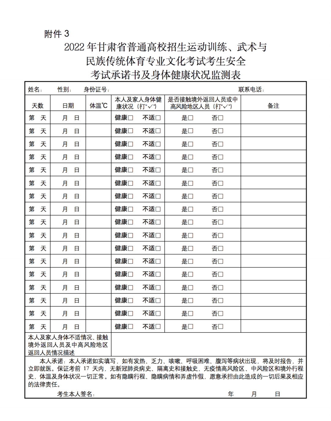 4.打卡合格的考生需持《2022年甘肅省普通高校招生體育藝術(shù)類專業(yè)準(zhǔn)考證》《身份證》《2022年運動訓(xùn)練、武術(shù)與民族傳統(tǒng)體育文化考試準(zhǔn)考證》和考前3天內(nèi)2次新冠肺炎核酸檢測陰性證明參加考試;打卡不合格的考生須持《2022年甘肅省普通高校招生運動訓(xùn)練、武術(shù)與民族傳統(tǒng)體育專業(yè)文化課考試考生安全考試承諾書及身體健康狀況監(jiān)測表》(見附件3)、《2022年甘肅省普通高校招生體育藝術(shù)類專業(yè)準(zhǔn)考證》《身份證》《2022年運動訓(xùn)練、武術(shù)與民族傳統(tǒng)體育文化考試準(zhǔn)考證》和考前3天內(nèi)2次新冠肺炎核酸檢測陰性證明按相關(guān)要求參加考試。