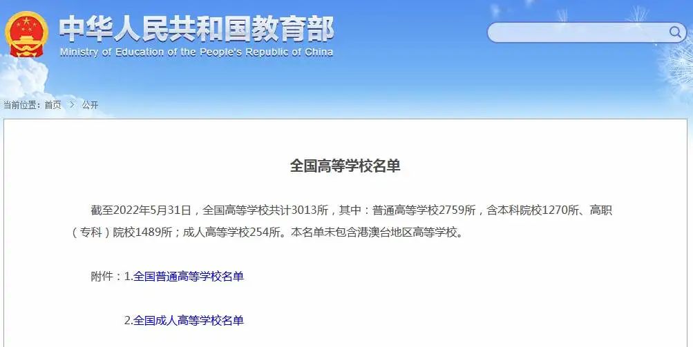 截至2022年5月31日,全國(guó)高等學(xué)校共計(jì)3013所,其中:普通高等學(xué)校2759所,含本科院校1270所、高職(專(zhuān)科)院校1489所;成人高等學(xué)校254所。本名單未包含港澳臺(tái)地區(qū)高等學(xué)校。