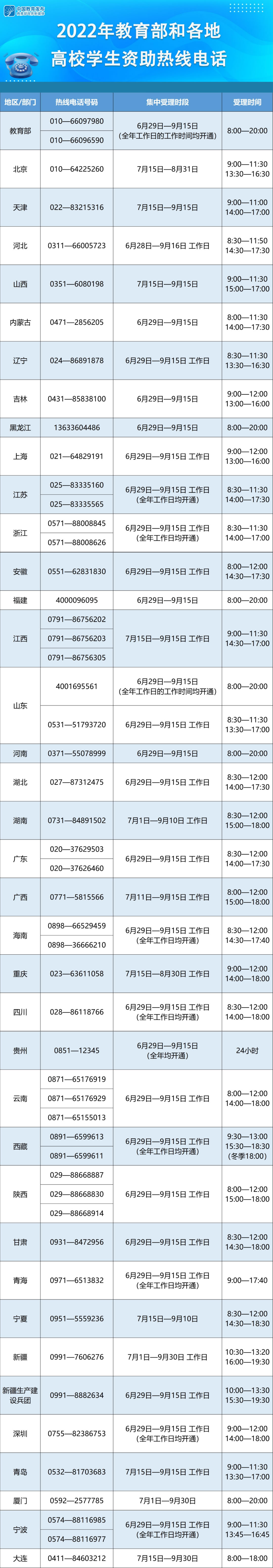 教育部要求各?。▍^(qū)、市)及所屬高校、中央高校學(xué)生資助管理部門均開通熱線電話,并結(jié)合實(shí)際情況自行確定集中受理時(shí)段和具體受理時(shí)間。