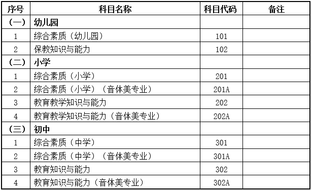 (二)為完善中小學(xué)教師資格考試制度設(shè)置,加強(qiáng)中小學(xué)音、體、美專業(yè)教師隊(duì)伍建設(shè),從2017年下半年考試開始,對(duì)音、體、美專業(yè)考生的筆試公共科目一、科目二(科目代碼:201、202、301、302)實(shí)行單獨(dú)編碼(相應(yīng)科目代碼:201A、202A、301A、302A),考試內(nèi)容暫與原科目相同。實(shí)行單獨(dú)編碼后,音、體、美專業(yè)考生在筆試報(bào)名時(shí)應(yīng)選報(bào)單獨(dú)編碼的公共科目。取得科目201A、202A合格的考生,面試僅限于參加小學(xué)類別音、體、美專業(yè)科目;取得科目301A、302A合格的考生,面試僅限于參加初中、高中、中職文化課音、體、美專業(yè)科目??忌勋@得科目201、202、301、302合格成績,可相應(yīng)替代科目201A、202A、301A、302A合格成績;考生已獲得科目201A、202A、301A、302A合格成績不可替代科目201、202、301、302合格成績。