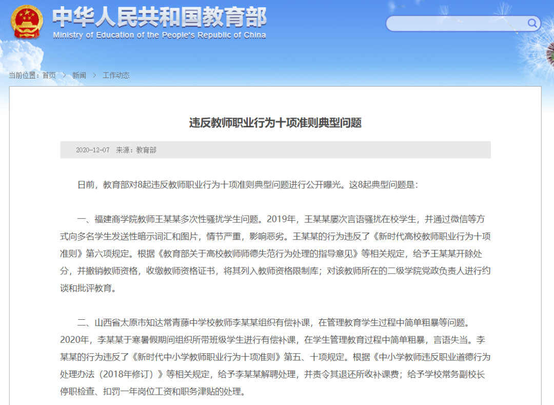 12月7日,教育部在官網(wǎng)“工作動態(tài)”板塊對8起違反教師職業(yè)行為十項準則典型問題進行公開曝光,其中,涉及高校有3起。