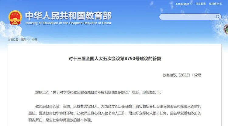 近日,教育部網(wǎng)站發(fā)布“關(guān)于對學校和教師做雙減教育考核制度調(diào)整的建議”的答復。答復中提到,教育部高度重視并采取多種措施,推動減輕教師負擔。
